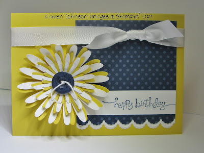 This is a really simple card. I used 5 layers of the Blossom Party Bigz Die, which I sprayed with Stampin' Mist to make it easier to screw up the flowers and break the fibers. I then offset them and secured them with a Lucky Limeade brad and 3/4" punch of Lucky Limeade cardstock.