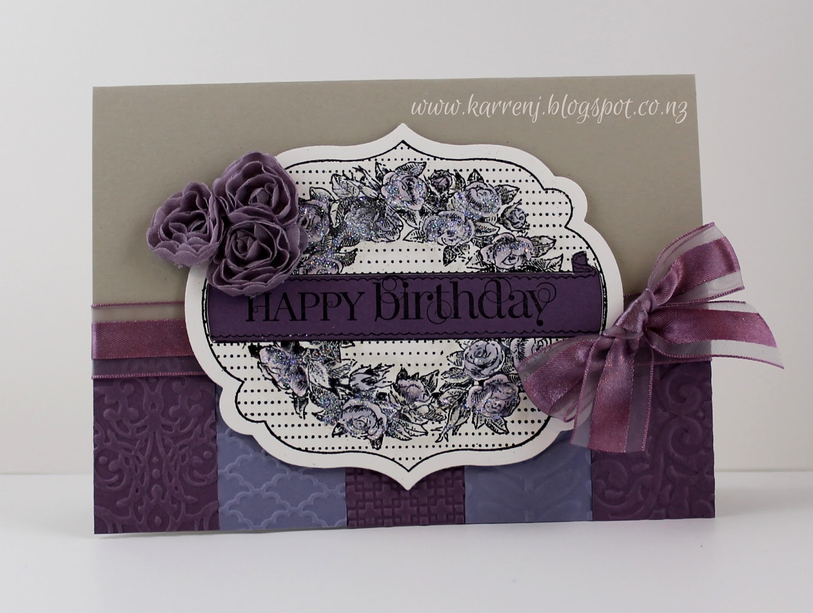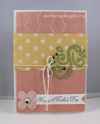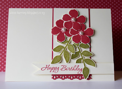I chose the pink/green, pearls and birthday squares in the tic-tac-toe grid. The green I used with Primrose Petals is Old Olive. The leaves, flowers and banner are all raised up on dimensionals and it's all offset against a Very Vanilla background.