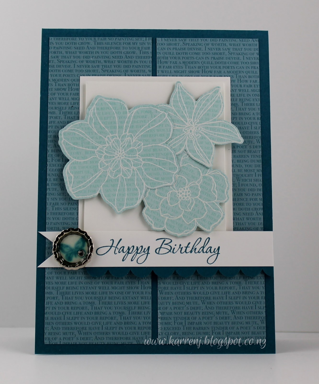 The background is more script DSP, this time Island Indigo. The little soda pop top was stamped using Collage Curios and coated in Crystal Effects and left to dry. When it was dry, I stuck a tiny little rhinestone on it.