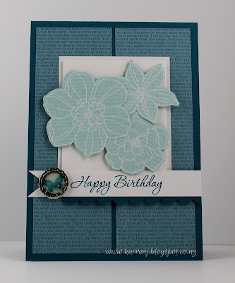 I white-embossed several flowers from Secret Garden onto Crumb Cake cardstock. I then "colored" them in with white ink and over-colored with Daffodil Delight and Island Indigo ink. (I still don't know what this technique is called, so if anyone knows it's name, please let me know LOL).