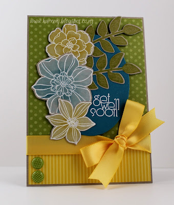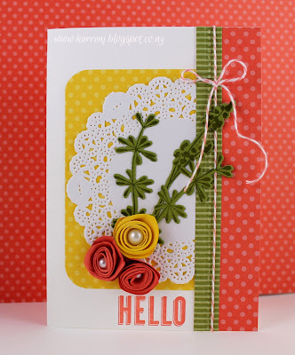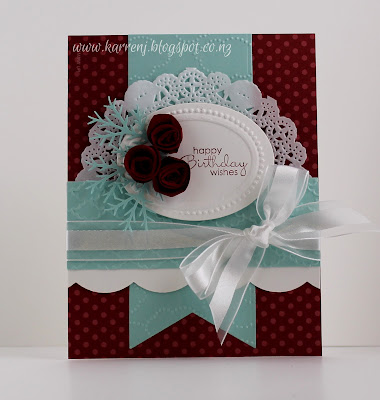 For my interpretation of the sketch, I used a paper doily as the circular feature. Because I couldn't get the bow to work horizontally, I went with a vertical look instead. Hard to see in the photo, but I dry embossed the Old Olive strip with the Needlepoint Border EF. The roses were made using a 1 3/4" circle punch.