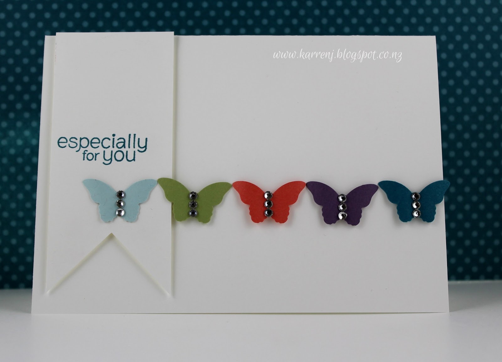 I punched Itty Bitty Butterflies out of Soft Sky; Pear Pizzazz; Calypso Coral; Perfect Plum and Island Indigo cardstock. I cut a tone-on-tone banner and adhered that using dimensionals. Then I positioned the butterflies across the card. Three little rhinestone jewels on each butterfly and a simple sentiment finish the card.