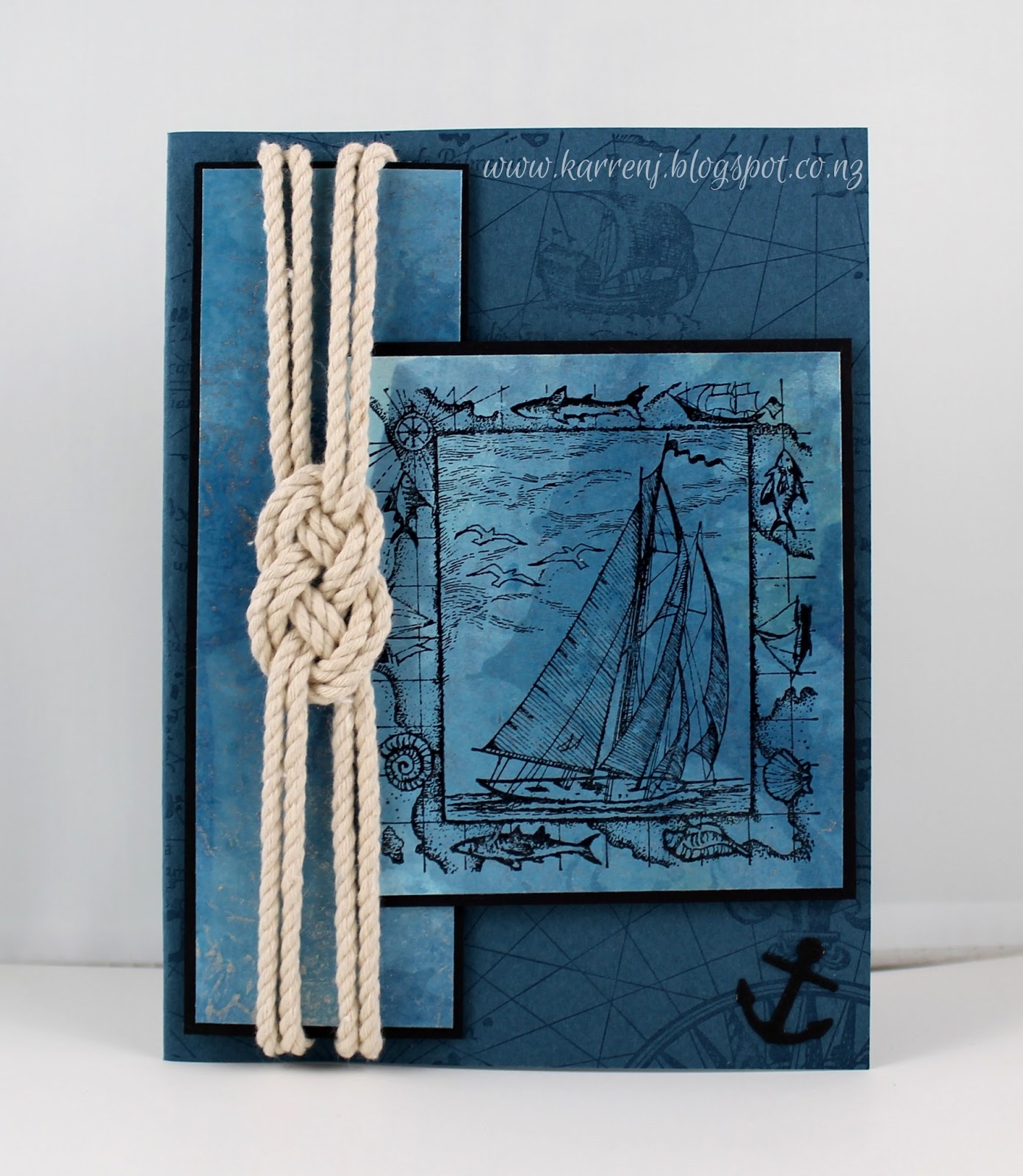 The sailor's knot was tied after Googling how to do it because it's been years since I last tied this knot. I used the long retired Rope Twine which really adds to the nautical theme (and to the bulkiness of the card)!