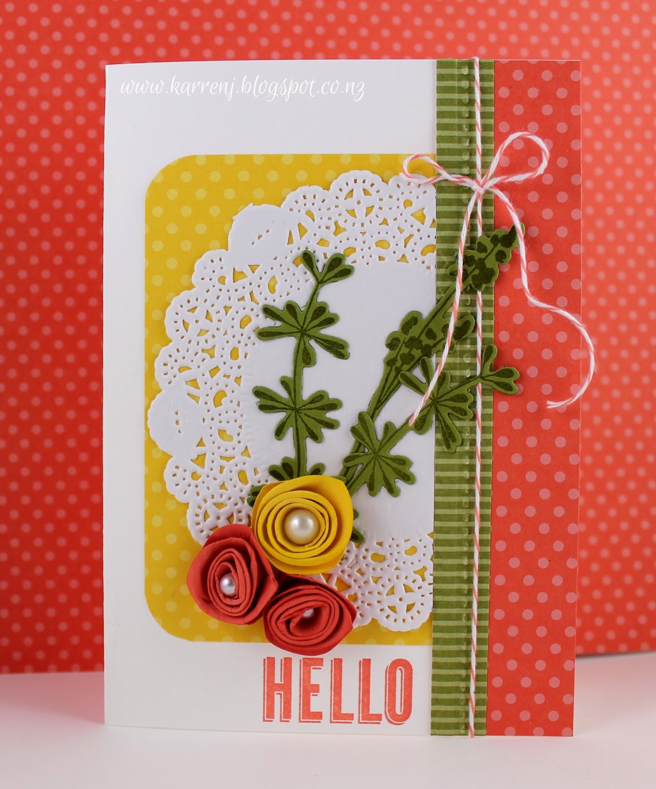 Accessories: Paper Doily; Calypso Coral Bakers Twine; Larger Than Life die (PTI); Basic Pearls; Jumbo Pearls; Corner Rounder; Needlepoint Border EF; 1 3/4" circle punch