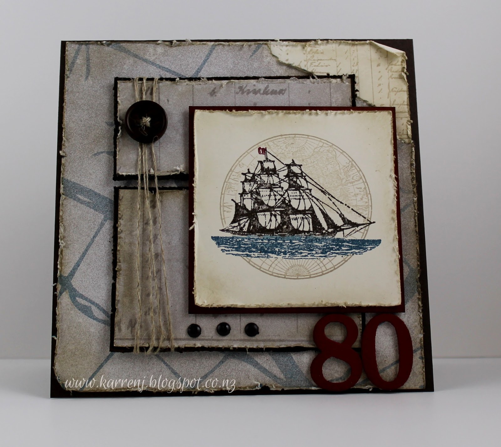 I inked up the ship using markers, then after stamping, I masked the ship and stamped the globe in Crumb Cake ink. I also distressed and sponged this layer. The "80" was die cut and sponged with Cherry Cobbler ink. Linen thread; neutrals brads and a Naturals Designer Button finish of the card.