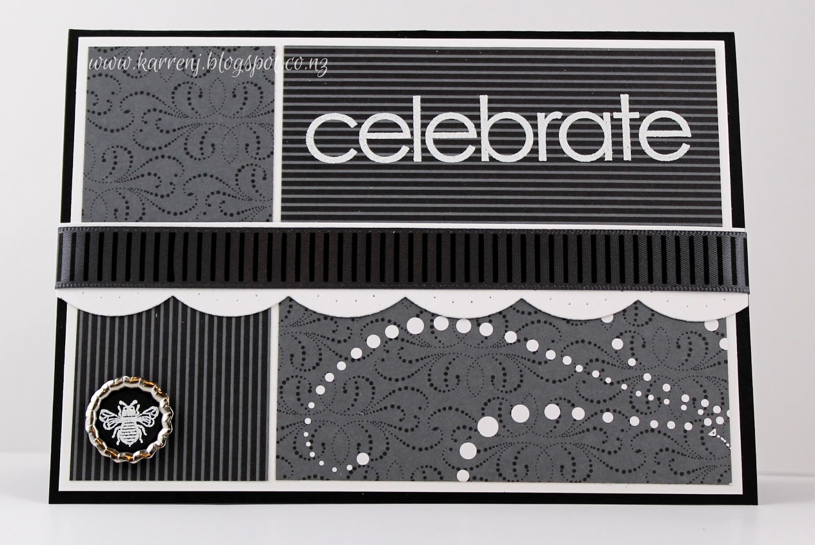 I white-embossed the word "celebrate" onto one of the pieces of DSP. The dots on the bottom right are part of the pattern. The scalloped border was paper-pierced and the soda pop top is a white-embossed bee on Basic Black cardstock.