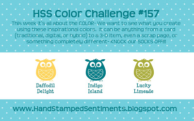 I combined the sketch challenge at Freshly Made Sketches with the color challenge at Hand Stamped Sentiments to come up with this card. I haven't had a chance to play with the HSS challenges for what seems like forever, so it was good to get to use these gorgeous colors together.